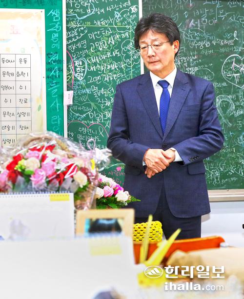 바른정당 유승민 의원이 세월호 참사 1000일을 하루 앞둔 8일 오후 경기도 안산시 단원구 안산교육지원청 별관에 마련된 단원고 4·16 기억교실을 찾아 교실을 살펴보고 있다. 연합뉴스