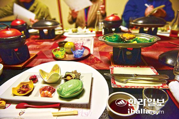 아지가사와마을 전통 청어요리를 비롯해 각종 회 전복찜, 눈당근젤리 등이 이어지는 카이세키요리(회석요리).