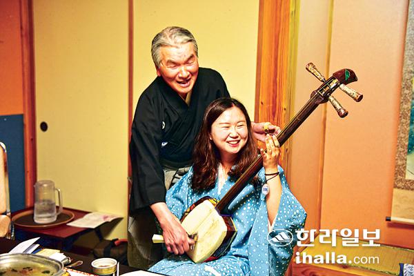 팸투어에 참여한 고귀혜씨가 쓰가루샤미센 연주자로부터 샤미센을 연주하는 법을 배우고 있다.