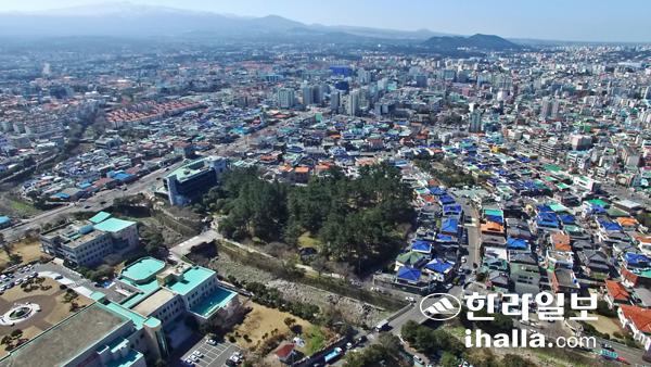 하늘에서 내려다 본 제주시내. 건물이 빼곡히 들어서 있는데 반해 녹지 공간은 드문드문 보인다. 강경민기자