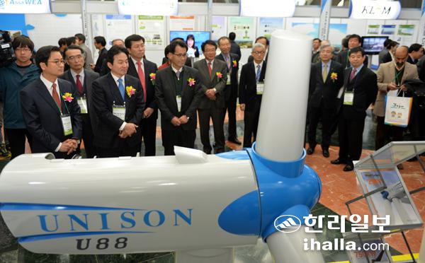2015년 제주국제컨벤션센터에서 열린 제3회 아시아풍력에너지박람회장을 참가자들이 둘러보고 있는 모습. 한라일보DB