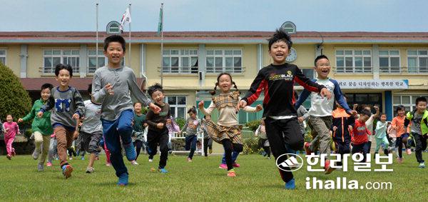 5일 제95회 어린이날을 맞아 도내 전역에서 다채로운 '어린이날 기념행사'가 열린다. 사진 위는 운동장을 시원하게 가로지르는 대흘초 어린이들의 모습. 사진=한라일보 DB