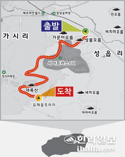 성불오름에 도착한 직후 가볍게 준비운동을 한 후 혹시 있을지도 모르는 진드기를 피하기 위해 기피제를 뿌리고 출발했다. 성불오름은 해발 360m가 조금 넘는 오름으로 번영로 도로변에서 쉽게 보인다. 방목장을 거쳐 탐방로를 따라 전망대에 올랐다. 30분쯤 올라 전망대에 도착하니 바로 아래 사이프러스 골프장의 전경과 이날 탐방할 오름인 대록산을 포함한 주변 오름이 한눈에 들어왔다.