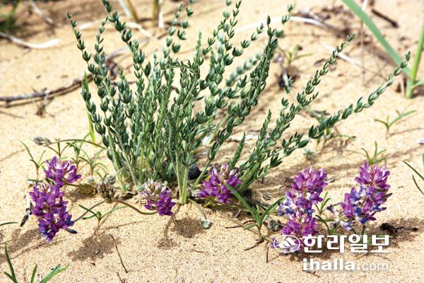 그 중에서도 화려하게 꽃이 피어 있는 식물에 눈길이 간다. 털두메자운(옥시트로피스 라체모사)이다. 이 종은 한반도에는 북부지방에만 분포하는데 정작 북한의 자료에는 이 학명이 기재되어 있지 않다. 같은 종을 아마도 '옥시트로피스 스트로빌라체아'로 쓰고 있는 듯 한데 검토가 필요한 부분이다. 1913년 나카이 타케노신이라는 일본학자는 이 종을 한국특산으로 보아 '옥시트로피스 코리아나'라는 학명으로 발표한 바 있으나 역시 통합됐다.