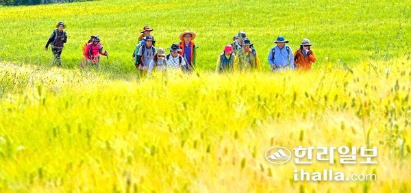 머리에만 살짝 노르스름한 빛을 이고 바람이 불 때마다 넘실대며 황금빛 물결을 일으키는 장관에 취해있을 때 한 중년 탐방객이 말을 걸어왔다. "옛날에는 익어가는 보리를 손으로 비벼서 껍질을 벗겨 먹곤 했어요." 무슨 말인지 몰라 멋쩍은 웃음만 짓고 있자니 함께 걷던 비슷한 연배의 탐방객들이 말을 거든다. "젊은 사람이라 모르죠? 어릴 때 이거 낫질하다 손도 많이 베었지" "그 때는 보리 이게 왜 그렇게 맛있었는지…." 그렇게 그들은 한참이나 어린 시절 이야기를 이어갔다. 그들을 보고 있자니 문득 그런 생각이 들었다. 그 길은 한 계절뿐 아니라 시간도 껑충 건너뛰게 하는 듯하다고. 분명 우리는 '2017년 늦봄 제주'의 어느 길을 걷고 있지만 그들은 잠시 그들 어린 시절 제주의 어디쯤을 함께 걷고 있는 것처럼 느껴졌다.