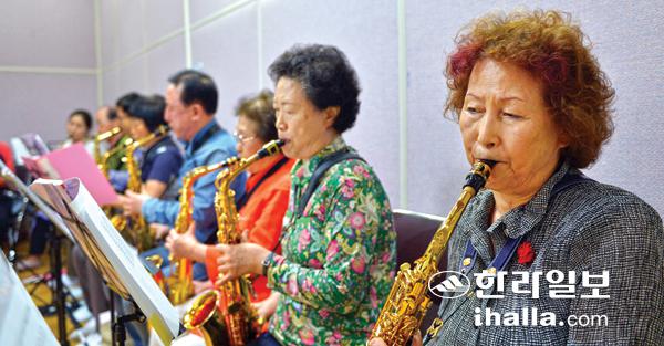 지난달 25일 제주특별자치도 노인복지관의 지하 연습실에서 색소폰 초급반 수강생들이 저마다 악기를 들고 연습하고 있다. 배움의 이유는 저마다 다르지만 이를 통해 모두가 삶의 활력을 찾고 있다. 강경민기자