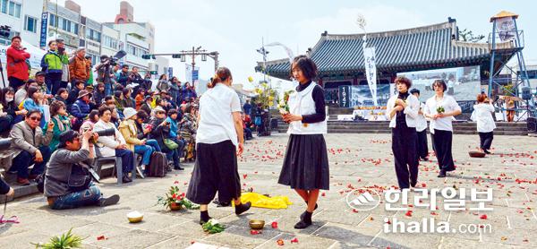 관덕정과 그 주변은 예나 지금이나 예술인들의 문화공간으로 활용되고 있다. 제주민예총이 지난 4월 관덕정 마당에서 4·3문화예술축전을 펼치고 있다. 사진=한라일보 DB