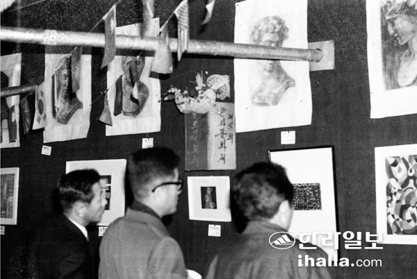 전시장이 생기기전 학교나 공공장소는 주요한 전시공간이었다. 1966년 한라문화제 전시 장면. 사진=제주예총 제공