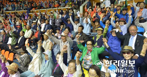 지난달 17일 제주시 한라체육관에서 열린 제45회 어버이날 행사에 참가한 어르신들이 밝은 표정을 지으며 즐거운 시간을 보내고 있다. 강경민기자