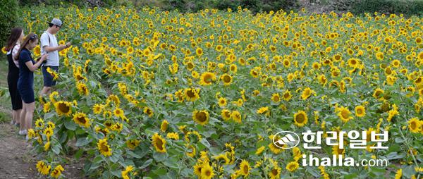 항몽유적지를 찾은 관광객들이 노오란 장관을 이룬 해바라기 꽃밭을 연신 카메라에 담으며 즐거운 시간을 보내고 있다. 강희만기자
