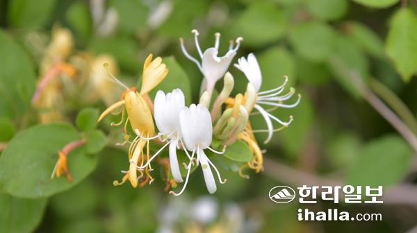 에코투어 길목에서 탐방객들이 추억담을 주고 받게 만든 인동초(인동덩굴꽃)