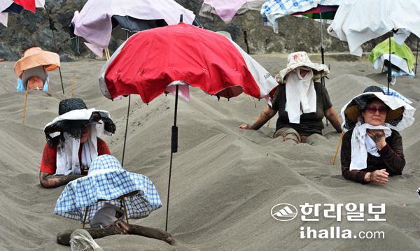제주시 삼양 검은모래해변에서 검은모래 찜질을 하고 있는 피서객들. 사진=한라일보 DB