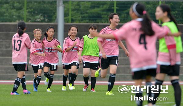 23일 제주시애향운동장에서 열린 2017 제주컵 여자축구대회 초등클럽부 B조 서귀북초와 삼성초 리그전에서 서귀북초 최예원(14번) 선수가 전반 13분 골을 넣고 동료들과 기뻐하고 있다. 강경민기자