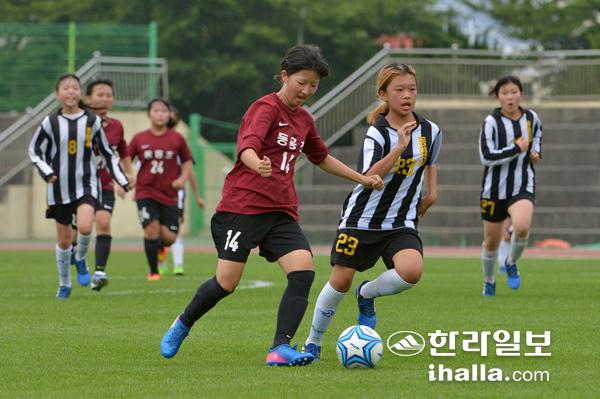 23일 제주시애향운동장에서 열린 2017 제주컵 여자축구대회 초등클럽부 A조 동홍초와 동화초의 리그전에서 동화초 현수아(14번)선수가 드리블 돌파를 시도하고 있다. 강경민기자