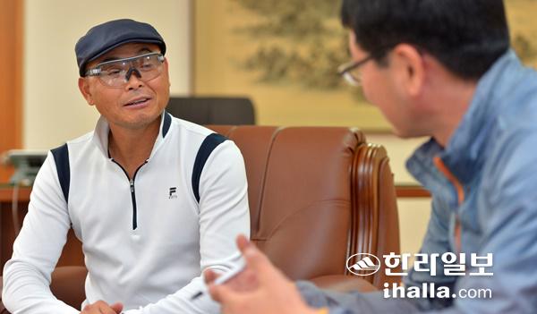 제주감귤국제마라톤대회 홍보대사 이봉주가 28일 본사 임원실에서 마라톤과 자신의 인생에 대해 진지하게 이야기 하고 있다. 강경민기자