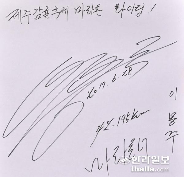 제주감귤국제마라톤대회 홍보대사 이봉주의 대회 성공 기원 사인. 강경민기자