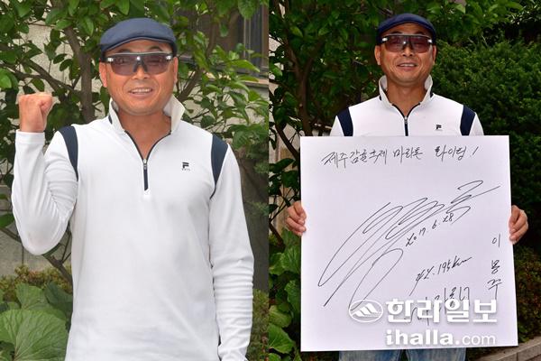 2017 제주감귤국제마라톤대회 홍보대사로 위촉된 '국민 마라토너' 이봉주가 28일 한라일보사를 방문해 대회 성공 개최를 위해 소중한 사인과 함께 힘찬 파이팅을 외치고 있다. 강경민기자