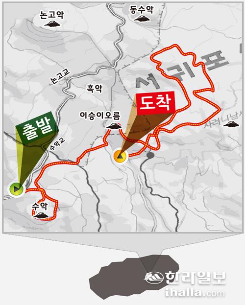 첫 목적지인 수악을 가기 위해서는 5·16도로변 수악교 인근에 위치한 한라산둘레길에서 출발해야 한다. 이곳에서 200m 정도 걸어가면 수악으로 향하는 경사가 다소 심한 내리막길이 나온다. 잘 닦여지고 평평한 송잇길을 걷다 갑자기 흙으로 된 비탈길을 만나니 현실과는 다른 별(別) 세계 입구로 들어가는 느낌이다.