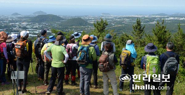 1 물오름 정상에 올라 발밑으로 펼쳐진 서귀포 전경을 눈에 담고 있는 탐방객들 강희만기자