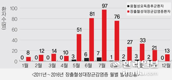 장출혈성대장균감염증의 잠복기는 2일~10일(평균 3~4일)이며, 임상증상은 발열·설사·혈변·구토·심한 경련성 복통 등이 주로 나타난다. 환자는 무증상에서부터 합병증인 용혈성요독증후군으로 인한 사망까지 다양한 경과를 보였다. 장출혈성대장균감염증 발생추이를 보면 2011~2016년 연간 평균 74명 수준으로, 2014년에 111명까지 발생해 예년에 비해 1.5배 많았다. 2014년 집단발생이 35건으로 예년 집단발생(연간 평균 14건)보다 2.4배 높은 것의 영향으로 분석됐다. 환자는 매년 5월부터 8월까지 주로 여름철에 많이 발생했고, 지역별로는 광주 78명(17.6%), 서울 63명(14.2%), 대구 52명(11.7%), 경기 44명(9.9%) 순이었다.