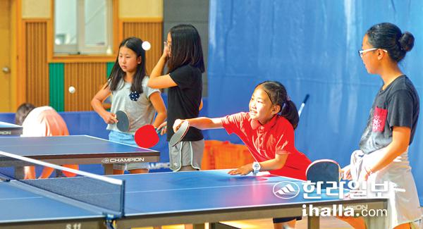 17일 오전 제주시 아라초등학교 학생들이 학교 체육관에서 탁구, 줄넘기를 하며 땀을 흘리고 있다. 강경민기자