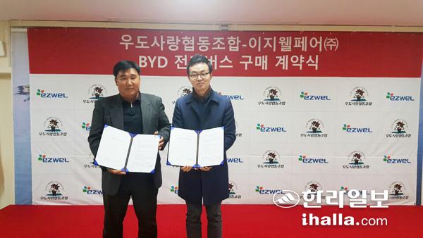 지난해 11월 29일 제주시 우도면사무소 대회의실에서 우도사랑협동조합과 국내 복지 플랫폼 코스닥 상장기업인 이지웰페어(주)가 중국의 BYD 전기버스 계약식을 가졌다.