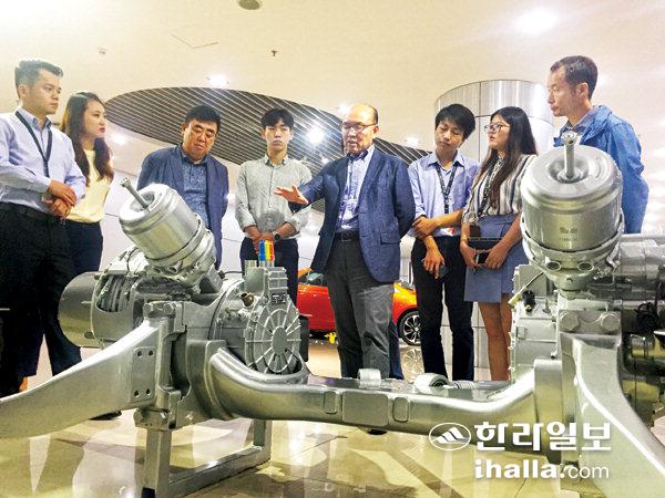 지난 4일 제주도내 버스업계 관계자들이 중국 BYD 심천 본사를 방문해 전기 버스에 장착되는 엔진을 살펴보고 있다. 송은범기자