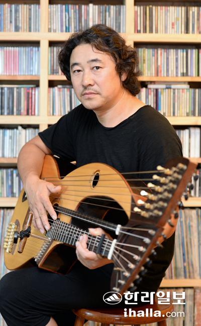 기타리스트 산하씨가 미국에서 3년 간 제작했다는 22줄의 하프 기타를 안아 보이고 있다. 강희만기자