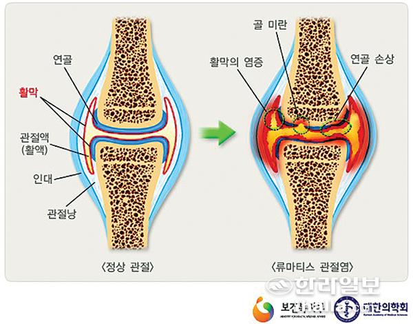▶류마티스 관절염=류마티스 관절염은 다발관절의 통증 및 붓기를 특징으로 하는 원인 불명의 만성 염증성 질환이다. 관절 안의 활막에서 발생하는 만성 염증으로 인해 치료하지 않을 경우 관절의 파괴와 변형이 일어난다. 관절뿐 만 아니라 다른 장기에도 침범할 수 있어 관절 외 증상으로 빈혈, 건조증후군, 피하결절, 폐섬유화증, 혈관염, 피부궤양 등이 발생되기도 한다. 관절의 손상은 관절염 발생 약 1~2년 이내에 진행됨으로 빠른 진단 및 치료가 중요하며, 같은 류마티스 관절염이라고 하더라도 관절의 염증 정도, 약물 반응 및 동반된 질환 유무에 따라 치료가 다르기 때문에 관절의 증상이 있을 경우 전문의의 진료를 받는 것이 중요하다.