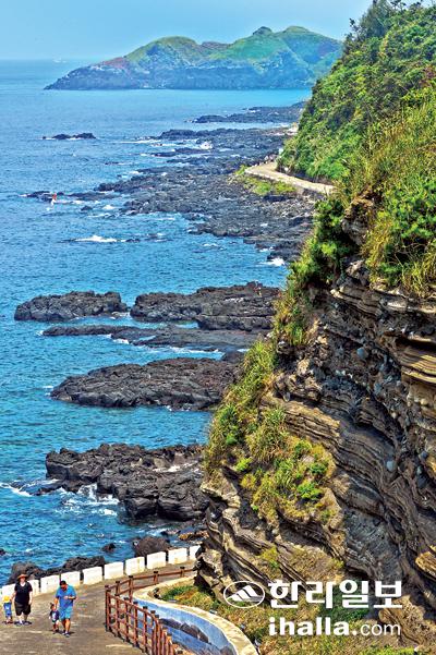 세계지질공원 수월봉 국제트레일 코스를 걷고 있는 탐방객들.