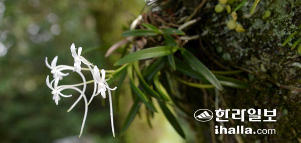 지난달 29일 '2017 제주섬 글로벌 에코투어'의 여덟 번째 탐방이 시작됐다. 이날 코스는 평소와 달리 오름을 등반하지 않고 효명사에서 선돌계곡을 따라 걸어 돈내코 등반로를 종점으로 하는 색다른 여정으로 준비됐다. 숲으로 들어가는 입구서부터 탐방객들의 시선은 나무 위에 핀 '풍란'에 집중됐다. 사진을 찍는 탐방객들을 보며 이권성 제주트레킹연구소장은 "선돌계곡은 습하고 바람이 없는 곳"이라며 "이곳에선 특히 꽃보다 풀을 유심히 봐야 한다"는 의미심장한 말을 남겼다.