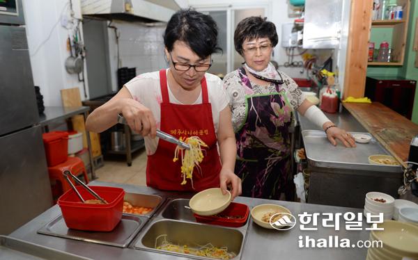 제주시 한라대학교 인근에 위치한 제주시니어손맛집에 근무하는 어르신들이 손님맞이 준비를 하고 있다. 제주시니어클럽은 도내 60세이상 어르신에게 다양한 일자리를 제공함으로써 노인 소득창출과 사회참여 기회를 제공하고 있다. 강희만기자.