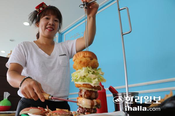 제주신화역사공원 인근에 위치한 '빨간모자마법사'의 37cm 높이의 로켓버거. 이태윤기자