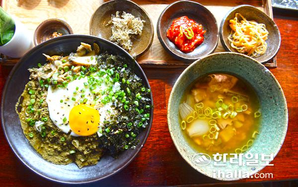 우선 꼬막 간장 비빔밥은 따뜻한 밥 위에 간장소스와 파, 참기름, 김 그리고 꼬막이 들어간다. 잘 비벼서 한 숟가락 떠 입으로 넣어보니 꼬막의 쫄깃한 식감이 먼저 입안을 압도한다. 여기에 달짝지근한 간장소스와 양념된 김 가루가 다소 밋밋할 수 있는 맛을 잘 보완해줬다. 비빔밥이 입에서 사라질 때쯤 구수한 된장국 한 수저를 곁들이니 입안이 깔끔하게 정리돼 다시 숟가락은 비빔밥으로 향한다.