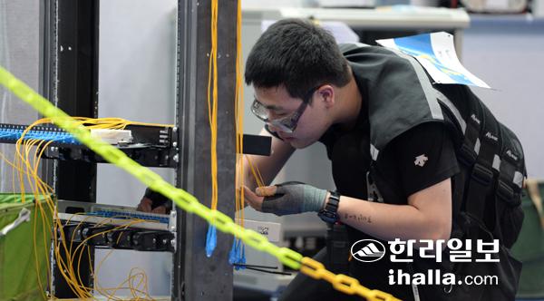 한림공업고등학교는 이달 4일부터 11일까지 제주에서 열리고 있는 제52회 전국기능대회 통신망분배기술 분야에서 대회 4연패 기록에 도전하고 있다. 사진은 올해 대회에 출전해 자신의 기량을 선보이고 있는 한림공고 박강호 학생. 강희만기자