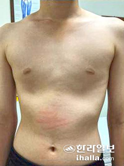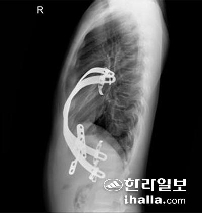 제주대학교병원에서 수술 받은 환아 B의 흉부외관 및 수술 후 X ray에 삽입돼 있는 막대가 선명하게 보인다.