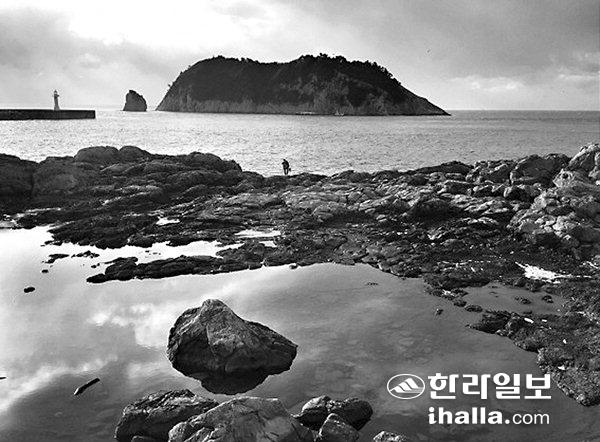 새섬에서 바라보는 문섬은 가까운 거리에 있어 스마트폰 카메라로 찍기에는 아주 좋다. 문섬과 수평선을 화면 상단에 놓고 아래 공간에 부주제를 넣어 이야기가 있는 사진을 만들어 내고자 하였다. 왼쪽에 멀리 흰색 등대를 두고, 앞쪽에 바위와 돌을 넓게 배치하면서 바위틈에 고인 바닷물의 반영도 찾아 구도를 잡았다. 그리고 낚시를 즐기러 가는 사람이 바닷가에 실루엣으로 보일 때까지 기다려 찍었다. 촬영 후 스마트폰 응용 프로그램(앱)을 이용하여 흑백으로 변환하였는데, 등대와 바위, 인물의 실루엣이 연출하는 흑백 분위기를 살리고 사진에 감성을 입히고자 한 것이다. <김민수·스마트폰 사진가, ‘쉽게 스마트폰 예술사진 잘 찍는 법’ 저자/특강, 서귀포 이중섭미술관창작스튜디오 입주 작가>