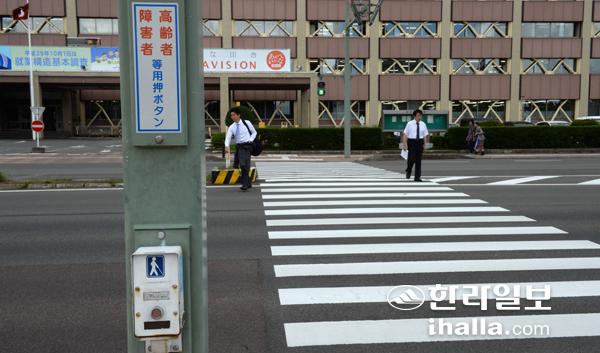 일본 아키타 횡단보도=아키타시청과 아키타 현청을 연결하는 왕복 6차로의 횡단보도는 천천히 걷는 고령자의 특성을 고려해 초록색 신호를 길게 조절할 수 있는 버튼이 있다.