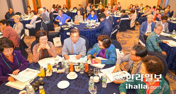 지난 9월말 메종글래드 제주에서 열린 '세계보건기구(WHO) 고령친화도시 국제네트워크 가입 인증 기념 국제세미나'. 세미나에는 모니터링단과 노인회 관계자들이 참석해 고령친화도시에 대한 높은 관심을 나타냈다. 강희만기자