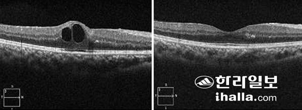 빛간섭단층촬영: 황반부종, 주사치료 전(좌측 사진) 소견, 주사치료 후(우측 사진) 소견. 사진 = 제주대학교병원 제공