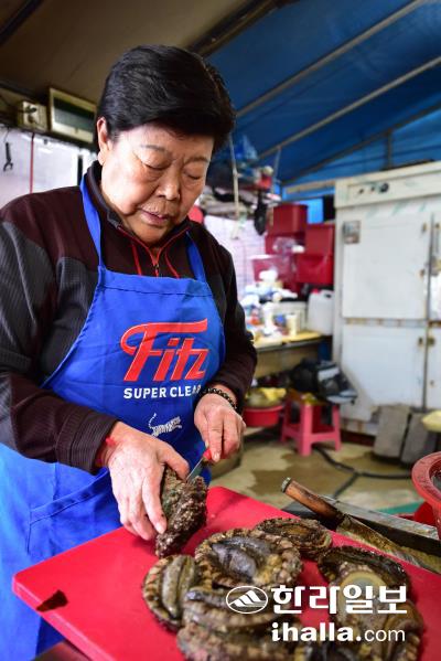 김씨를 만나기 위해 찾은 곳은 기장군 연화포구를 끼고 조성된 천지할매식당이다. 이곳은 즐비한 식당 중에서도 초창기부터 운영돼 38년간 운영되고 있다. 늦은 점심을 먹고 있던 김씨가 취재팀을 맞았다.
