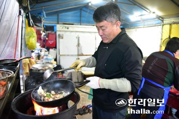 김정자 해녀와 함께 음식을 하고 있는 큰 아들.