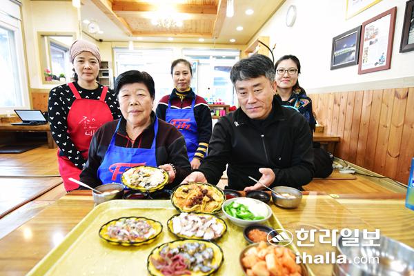 함께 식당을 운영하고 있는 김정자 해녀와 가족들. 사진=강동민 기자