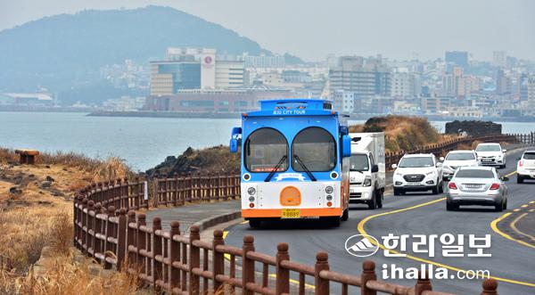 시티투어버스를 타고 제주를 여행하는 관광객과 해안을 달리는 시티투어버스. 사진=한라일보 DB