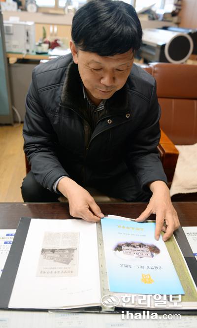 오현고 우정학사의 준공·기증식 등에 대한 기록을 설명하고 있는 강재길 부장.