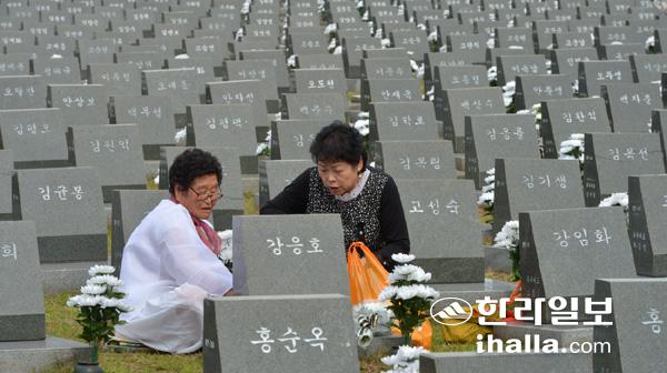 제주4·3사건이 올해로 발생한 지 70년이 됐다. 이에 제주도는 제주4·3의 전국화와 세계화를 위해 2018년을 '제주 방문의 해'로 정했다. 도는 올해 사업비 147억여원을 투입해 5개 분야에서 117개 기념사업을 추진키로 했다. 사진은 4·3위령제에 참석해 눈문을 흘리는 유족. 사진=한라일보 DB
