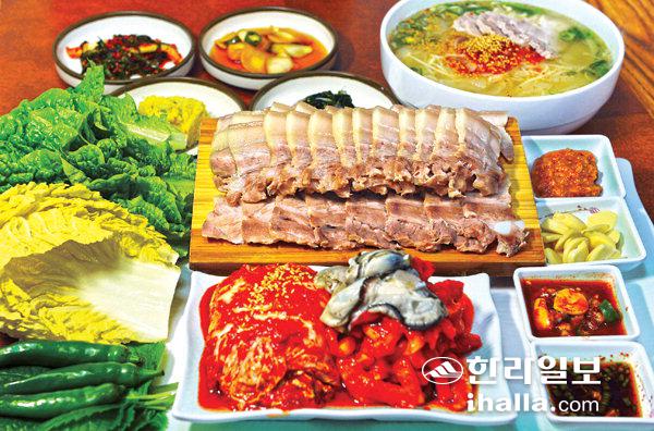 제주돔베고기집에서 가장 많이 찾는 메뉴는 나무 도마에 돼지고기 수육을 먹기 좋게 썰어낸 '돔베고기'와 싱싱한 굴이 올려진 '보쌈김치'가 더해진 김치돔베보쌈이다. 강경민기자