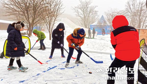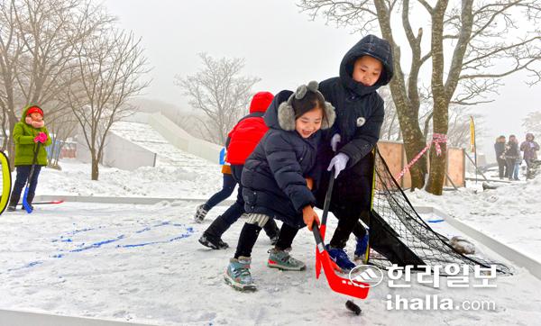 제주윈터페스티벌에서 눈놀이를 즐기고 있는 어린이들.