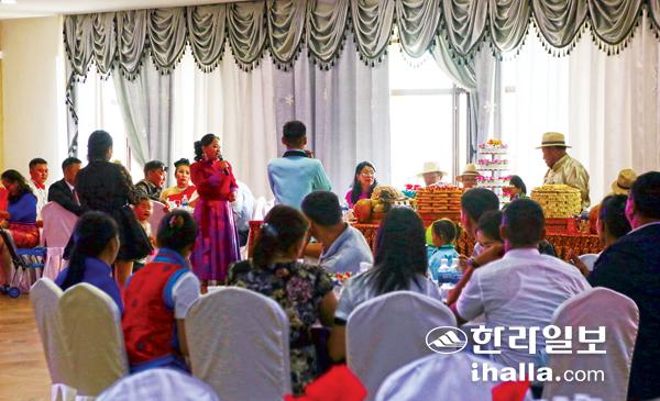 우리가 저녁식사를 주문한 호텔식당에선 마침 결혼축하연이 열리고 있었다. 신부의 드레스는 서양식에서 몽골식이 가미된 스타일이었다. 신랑은 턱시도에 나비넥타이 차림으로 우리나라와 비슷했다. 어르신들은 대부분 몽골식 델 복장이었다. 이러한 풍경들 역시 우리나라에서 한복을 입는 것과 같은 모습이라고 할 수 있을 것이다.