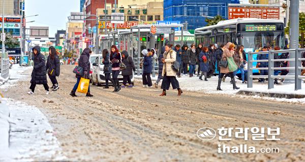 지난 10일부터 12일까지 사흘간 도 전역에 폭설이 내려 대부분의 도로가 결빙된 가운데 도민들의 발인 대중교통이 제대로 운영되지 않았다는 지적이 일고 있다. 결행·지연 구간에 대한 정보가 제대로 통보되지 않아 도민들의 불만이 폭발했다. 강경민기자